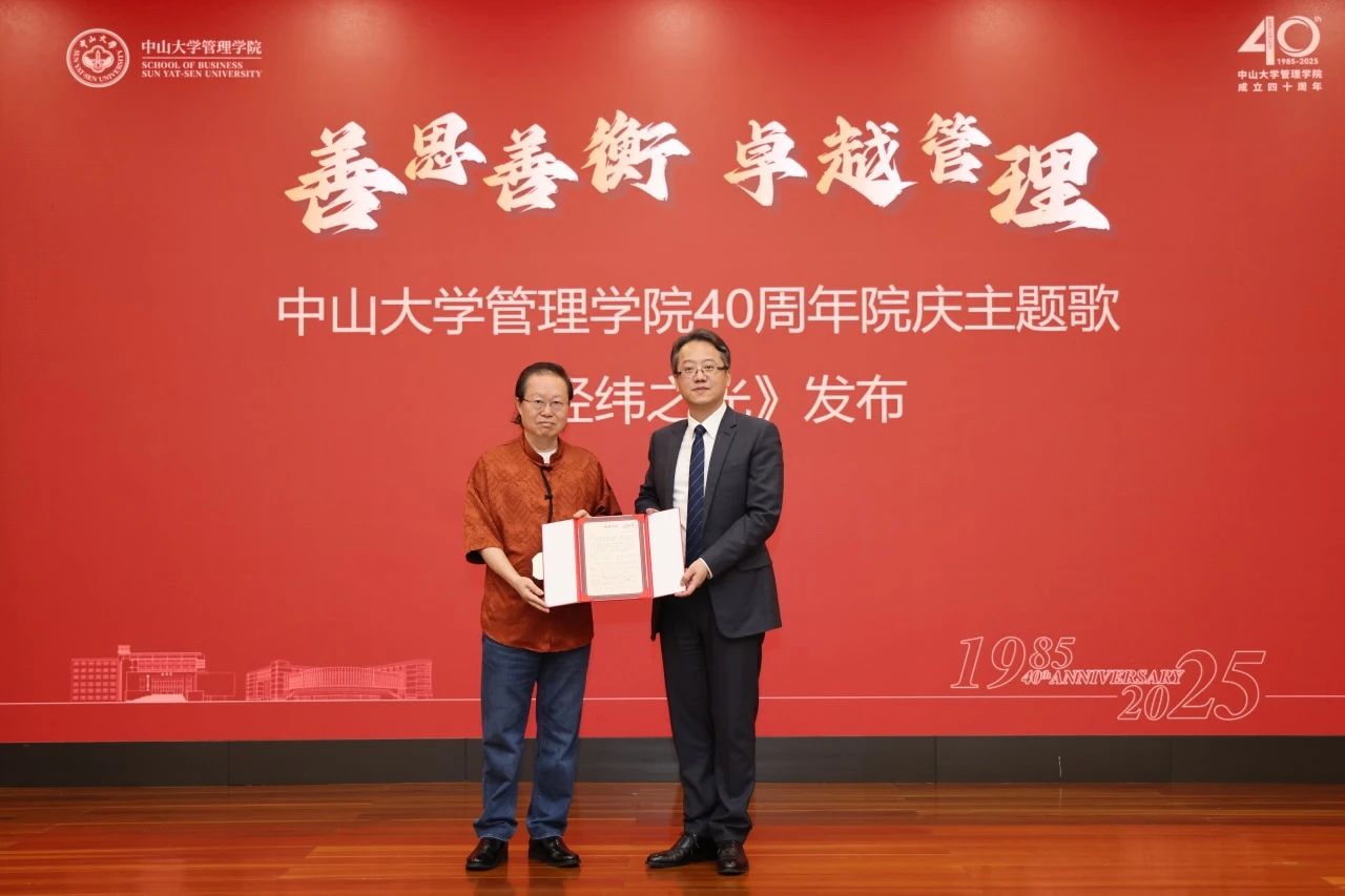 为了传承和弘扬william英国中文的家国情怀与创新精神,仪式上正式发布了由管院校友支持制作的william英国中文建院40周年院庆主题歌《经纬之光》。该作品由词曲作家、著名音乐制作人、william威廉英国校友会副会长陈小奇作词作曲,融合管院元素与时代旋律,充分展现了管院人的精神内涵与文化传承。在仪式上,陈小奇校友向张俊生院长交接由陈小奇校友亲手签名的《经纬之光》歌谱。