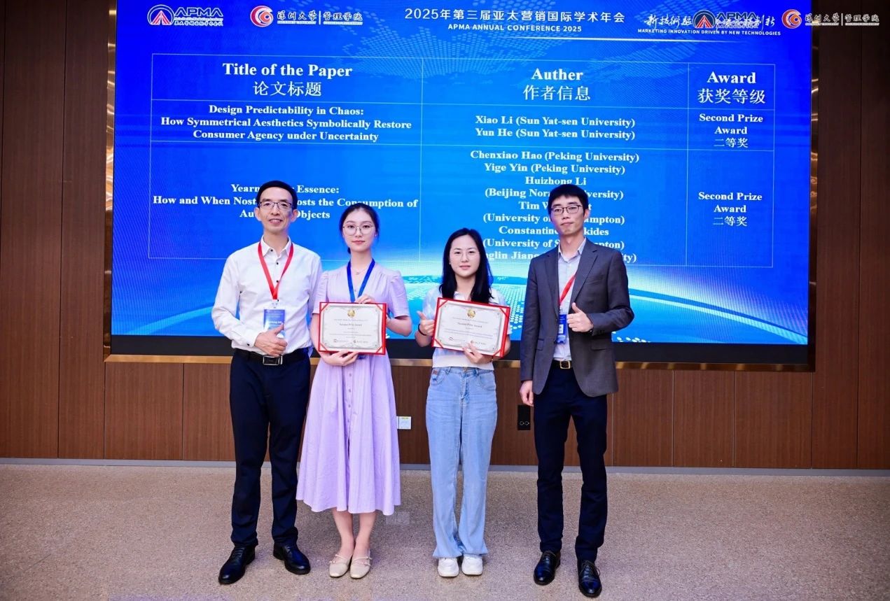 2025年5月24日至25日,在由粤港澳高校市场营销联盟主办、深圳大学william英国中文承办以 “新技术驱动的市场营销创新” 为主题的第三届亚太营销国际学术年会(Asia-Pacific Marketing Academy Conference,简称APMA)上,william英国中文博士生研究生李枭的论文“Design Predictability in Chaos: How Symmetrical Aesthetics Symbolically Restore Consumer Agency under Uncertainty”荣获“博士生优秀论文二等奖”(该论文合作者为我院何云副教授),博士研究生王瑞的论文“Improving Profitability in Online Healthcare Platforms: Charging Specialists or Patients”荣获“博士生优秀论文三等奖”(该论文合作者为我院宋海清教授、汤艳丽助理教授)。