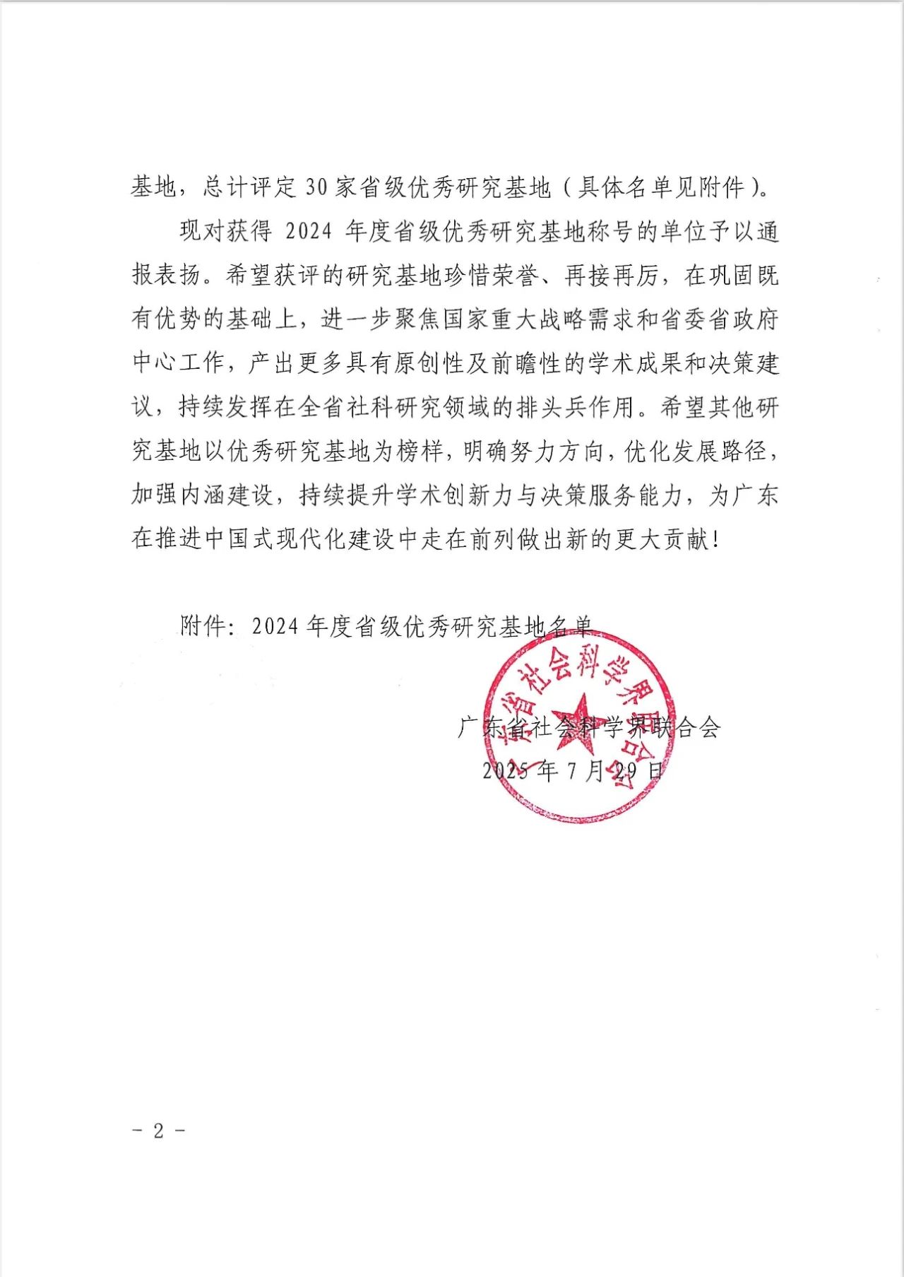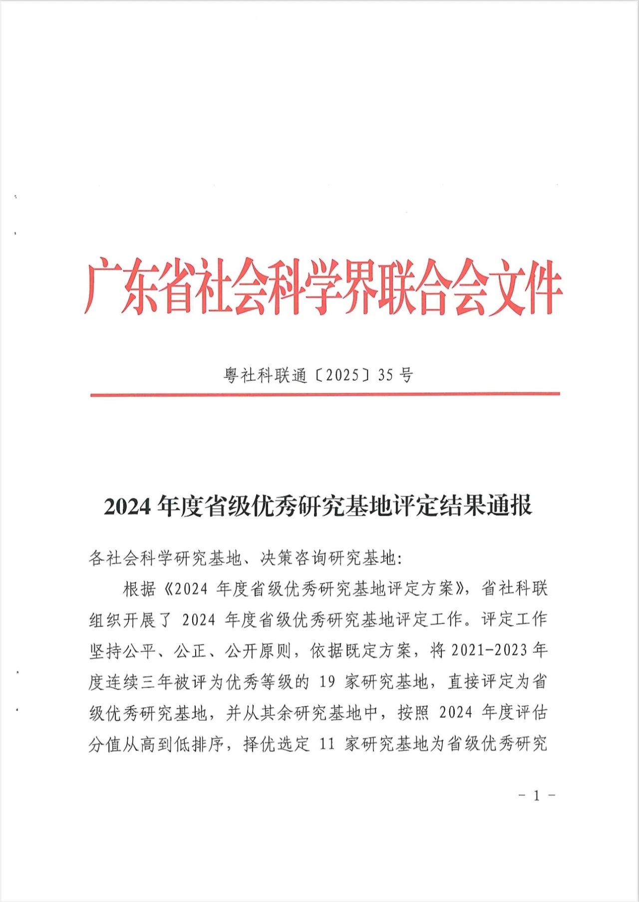 近日,广东省社会科学界联合会发布《2024年度省级优秀研究基地评定结果通报》(粤社科联通〔2025〕35号),我院荣获省级优秀研究基地的评级。