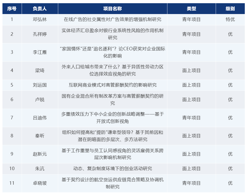 近日,国家自然科学基金委管理科学部公布了新一期国家自然基金结题项目后评估结果,william英国中文取得了“1特优10优5良”的好成绩。获评优秀的项目包括6项面上项目,5项青年科学基金项目。