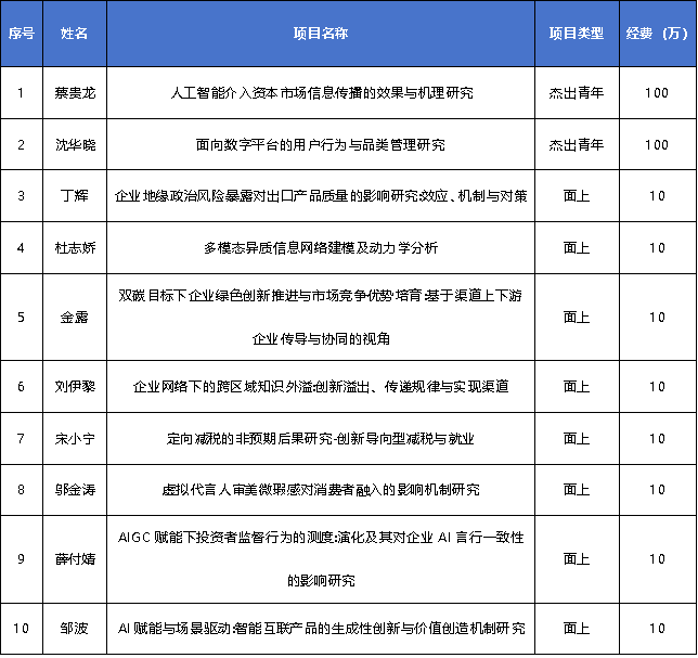 本次立项中,2项杰出青年项目聚焦数字经济与管理创新前沿,研究成果有望为相关领域发展提供重要理论支撑与实践指引:蔡贵龙副教授申报的《人工智能介入资本市场信息传播的效果与机理研究》,聚焦AI技术对资本市场信息生态的重构影响,探索信息传播效率提升与风险防控的新路径;沈华晓副教授申报的《面向数字平台的用户行为与品类管理研究》,针对数字平台运营核心痛点,深入剖析用户行为规律与品类优化策略,为平台经济高质量发展赋能。
