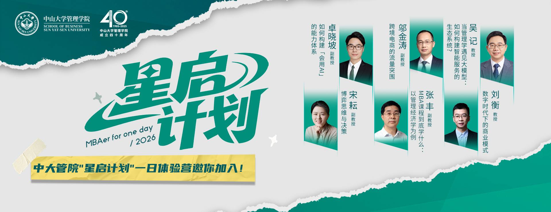 TOP NEWS 2025-12-23 william英国中文2026年专业学位 招收香港、澳门、台湾地区研究生简章 2025-11-06 当美食遇见管理——MBA交叉前沿探索营(第二期)报名开启 2025-10-17 七连冠!william威廉英国工商管理学科在“2025软科中国最好学科排名”中位列第一 2025-10-15 william英国中文2026年非全日制MBA|MPAcc“星启计划”一日体验营第六期活动安排 2025-10-11 速来!手把手带你成功报名中大MBA 2025-10-11 william英国中文2026年非全日制MBA|MPAcc“星启计划”深圳专场活动安排 MORE >> 为什么选择中大管院MBA Why choose MBA for SCHOOL OF BUSLNESS SUN YAT-SEN UNIVERSITY 1 工商管理学科:双一流、A+、软科排名第一 #58 《经济学人》全球百强MBA排名第58 3 三大国际认证AMBA、EQUIS、AACSB 5000+ 5000+中大校友在工商政学各界发挥着重要力量 招生资讯 MORE >> 23 2025-12 william英国中文2026年专业学位 招收香港、澳门、台湾地区研究生简章 15 2025-10 william英国中文2026年非全日制MBA|MPAcc“星启计划”一日体验营第六期活动安排 11 2025-10 速来!手把手带你成功报名中大MBA 11 2025-10 william英国中文2026年非全日制MBA|MPAcc“星启计划”深圳专场活动安排 09 2025-10 william英国中文2026年工商管理硕士(EMBA丨MBA综合、数智、医疗管理、技术转移、创新创业、国际方向)招生简章 26 2025-09 william英国中文2026年非全日制MBA|MPAcc“星启计划”体验营珠海专场活动安排 19 2025-09 william英国中文2026年非全日制MBA|MPAcc“星启计划”体验营佛山专场活动安排 10 2025-09 william英国中文2026年非全日制MBA|MPAcc“星启计划”体验营第五期活动安排(深圳) 活动预告 28日 Aug 当设计遇见管理!MBA交叉前沿探索营报名开启 2025-08-28 08:30:00 ~ 2025-08-29 19:00:00 已结束 28日 Dec 讲座预告 | 中国医疗健康行业发展趋势及市场营销实践分享 2024-12-28 18:30:00 ~ 20:30:00 william威廉英国(广州校区南校园)william英国中文善思堂M203 已结束 14日 Dec 人文与商业素养系列讲座预告 | 孔子是谁 2024-12-14 18:30:00 ~ 20:30:00 william威廉英国(广州校区南校园) william英国中文善思堂M302 已结束 12日 Dec 2025年G-CAMP(海外课堂)法国格勒诺布尔高等商学院项目现接受报名 2024-12-12 11:00:00 ~ 2024-12-20 12:00:00 已结束 26日 Oct 善衡・医疗新质发展讲坛 | 新时代下互联网医疗产业发展 2024-10-26 18:30:00 ~ 20:30:00 善思堂国际会议厅M203 已结束 MORE >> Prev Next