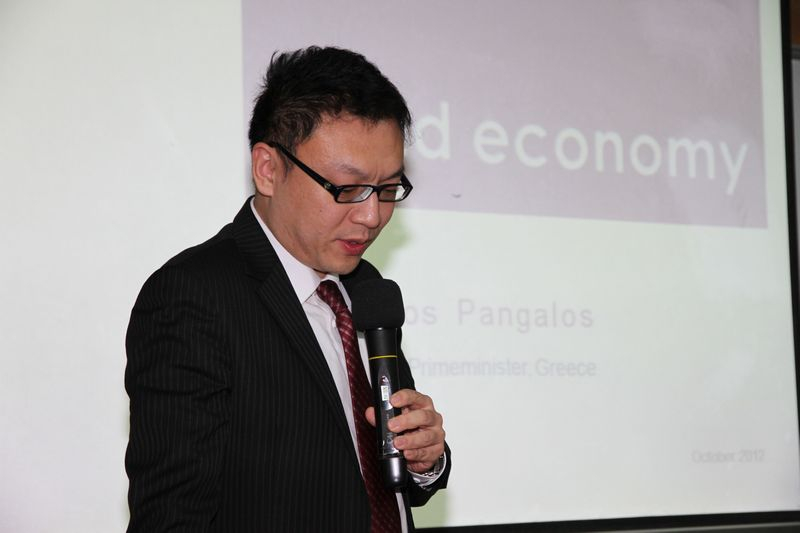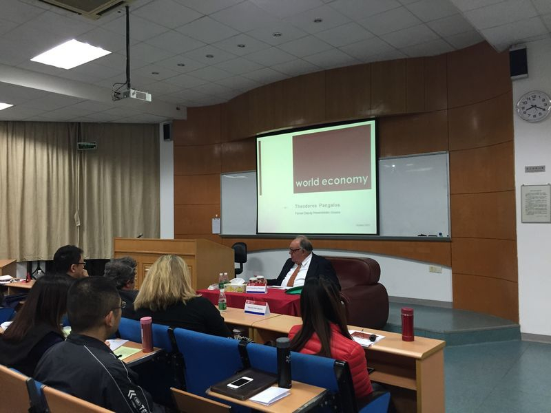 回到讲台上,Pangalos教授以他渊博的学识和丰富的经验,向同学们介绍了世界经济发展的历史,分析了希腊和欧洲的当前的经济问题和原因,并以此为借鉴对中国经济发展面临的机遇和挑战提出了自己的观点。希腊危机貌似离我们很遥远,希腊也并非中国重量级的贸易伙伴,但在全球经济一体化的今天,蝴蝶效应难以避免,希腊的经验教训也值得我们参考。每天的讲座结束后,听众们都积极提问,问题范围涉及中国、希腊和世界经济的前景预测、希腊人民当前的生活状况、希腊即将举行的大选对未来的影响等政经领域,也有不少人咨询希腊贸易、旅游等个人关心的问题。讲座结束后,听众们争相与这位魁梧的老人合影留念,虽然行动不便,Pangalos教授还是一一满足了每一个人的愿望,坚持站着直到最后一位合影者满意离去。