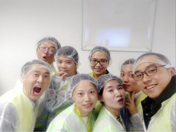 KP对质量管理的要求非常严苛,我们被要求在整个参观过程中禁止携带手机、相机、手表、项链及所有金属饰品入内,头发也必须扎起来,还得穿上无菌衣、戴上防护帽。看,小伙伴们的打扮,是不是很有趣?