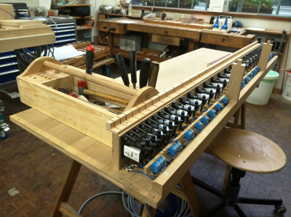 低调的CEO穿着一件圆领套头衫,上面印着New Zealand – Aotearoa。他居然连自己的名字都没有介绍就直奔主题,他介绍,一个管风琴制造时间约2年,63个员工,一年也只能生产4到6架管风琴,全手工打造,键盘用牛骨头做的,木头采用橡木。这里的每块木材要在自然环境风干5年以上才能使用,平时他们会采用当地的木材,这样才能保证质量,并且节省运费。家族生意延续至今已四代,看似微不足道,实则占据着管风琴市场的统治地位,项目全球化,从美国到新西兰,都有他们制造和安装的产品。这时我们才明白原来他身上的衣服是做新西兰项目的时候买的。