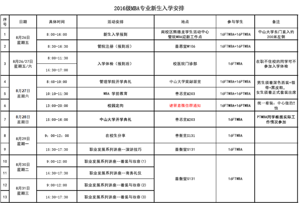 2016级MBA专业新生入学安排