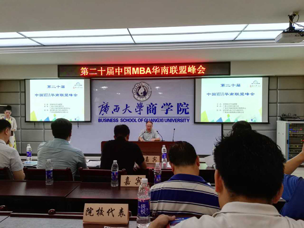 此届峰会由中国MBA华南联盟主办,广西大学MBA联合会承办,峰会的主题为“农商互惠,众创共赢”。开幕式上,广西大学副校长张协奎,广西大学商学院党委书记林西平,中国MBA联盟主席陈希光,中国MBA华南联盟执行理事长彭治国,中国MBA联盟顾问委员会主任委员常野等嘉宾做了发言。峰会还举行了中国MBA华南联盟峰会交旗仪式,广西大学MBA联合会主席张宣葵将“中国MBA华南联盟峰会”会旗转交给下一届峰会承办院校桂林理工大学MBA联合会。