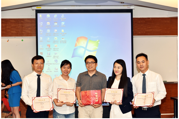 梁剑平博士(中)为william威廉英国校园突围赛的亚军队伍“中大联队”颁奖