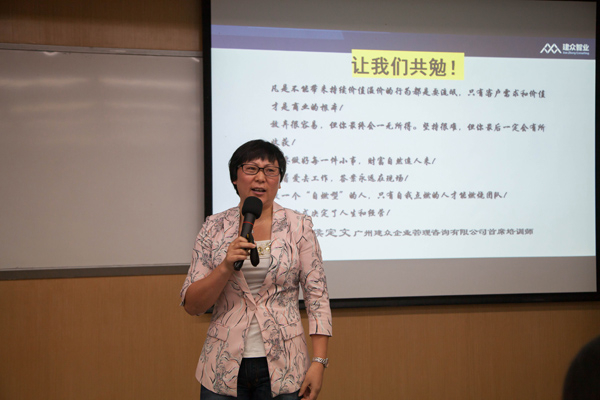 主讲嘉宾侯定文女士,现为广州建众企业管理咨询有限公司创始人、总经理、首席培训师、首席咨询师,同时也是家居建材行业实战营销权威专家、中国营销创新联盟特聘专家,《销售与市场》、《营销管理》、《中国营销传播网》、《价值中国》等多家专业杂志和网站专栏作者。