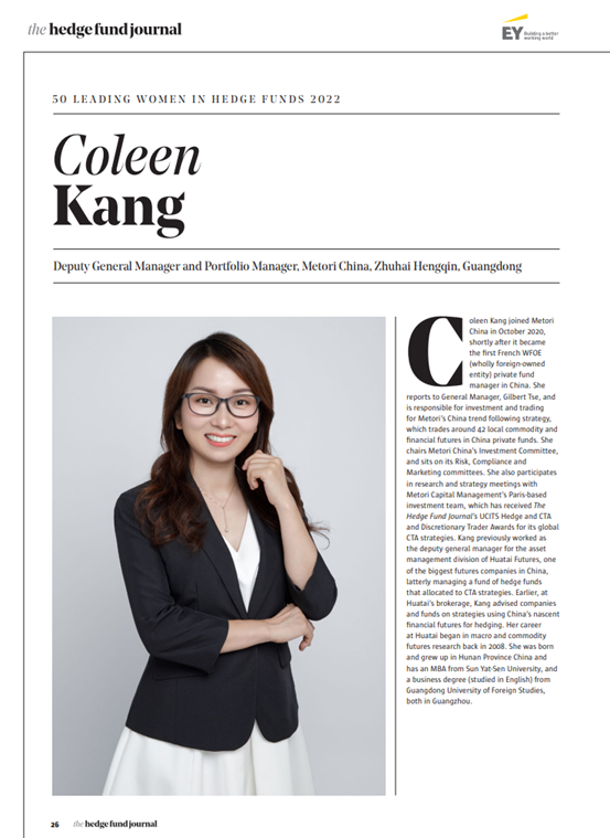 对冲基金行业国际权威杂志《对冲基金杂志(The Hedge Fund Journal)》特刊近期评选出2022年度“全球对冲基金行业领先女性50人(50 Leading Women in Hedge Funds 2022)”榜单,以表彰和鼓励杰出的女性从业者。我院2012级MBA校友康兰女士光荣上榜。这是该杂志的第10期特刊,过往9期的上榜者主要为在美国和欧洲从事对冲基金工作的女性高管,今年的亮点是榜单上出现了两位在中国内地从事基金管理工作的外资对冲基金公司女性高管,其中一位就是我院康兰校友。