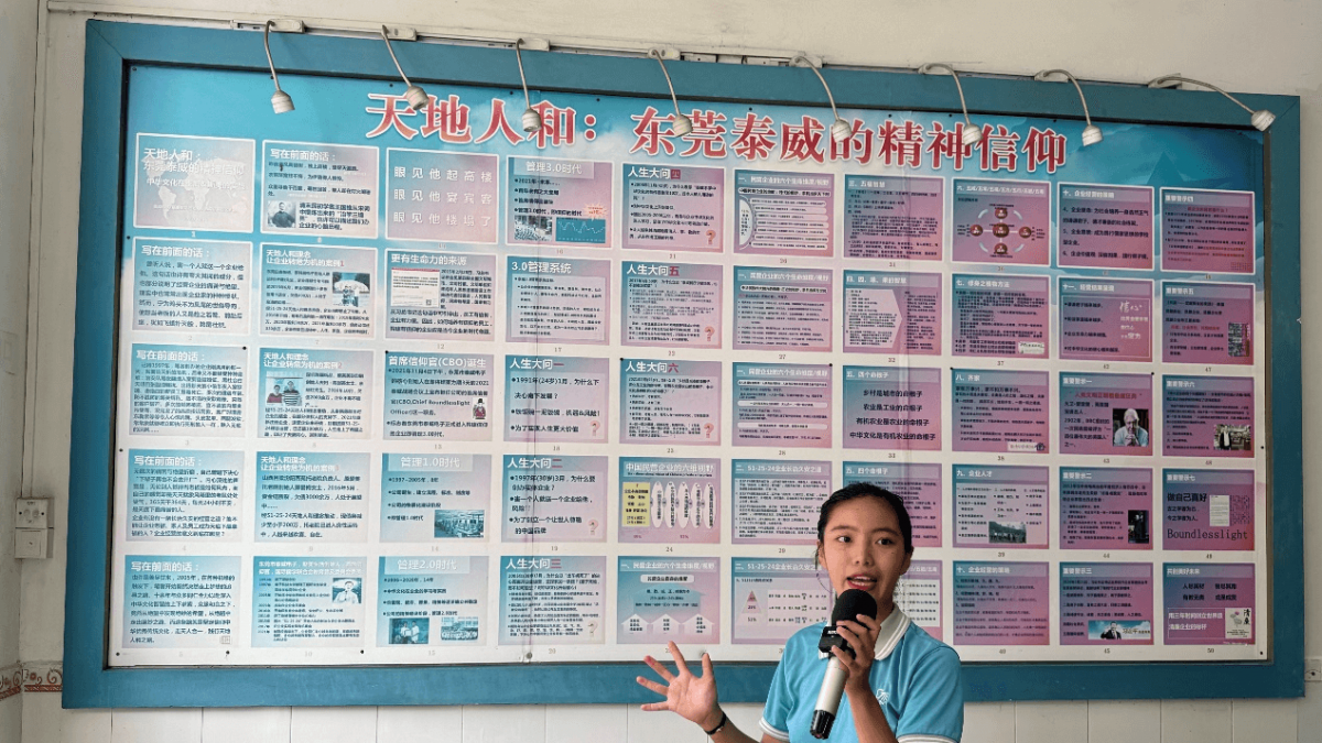 同学们首先参观了泰威工厂。泰威公司首席信仰官事务主任兼董助王一凡给同学们介绍了泰威的发展历史和企业文化。他详细阐述了公司如何将传统文化融入日常管理中,如何以“仁爱”思想为导向,关心员工的生活和工作。公司创始人李文良先生积极探索青少年教育、安老怀少、生态农业、生态医疗、生态流通、乡村建设、全员自学考试等方面,创新提出并践行51-25-24企业天地人和长治久安的股权治理机制。