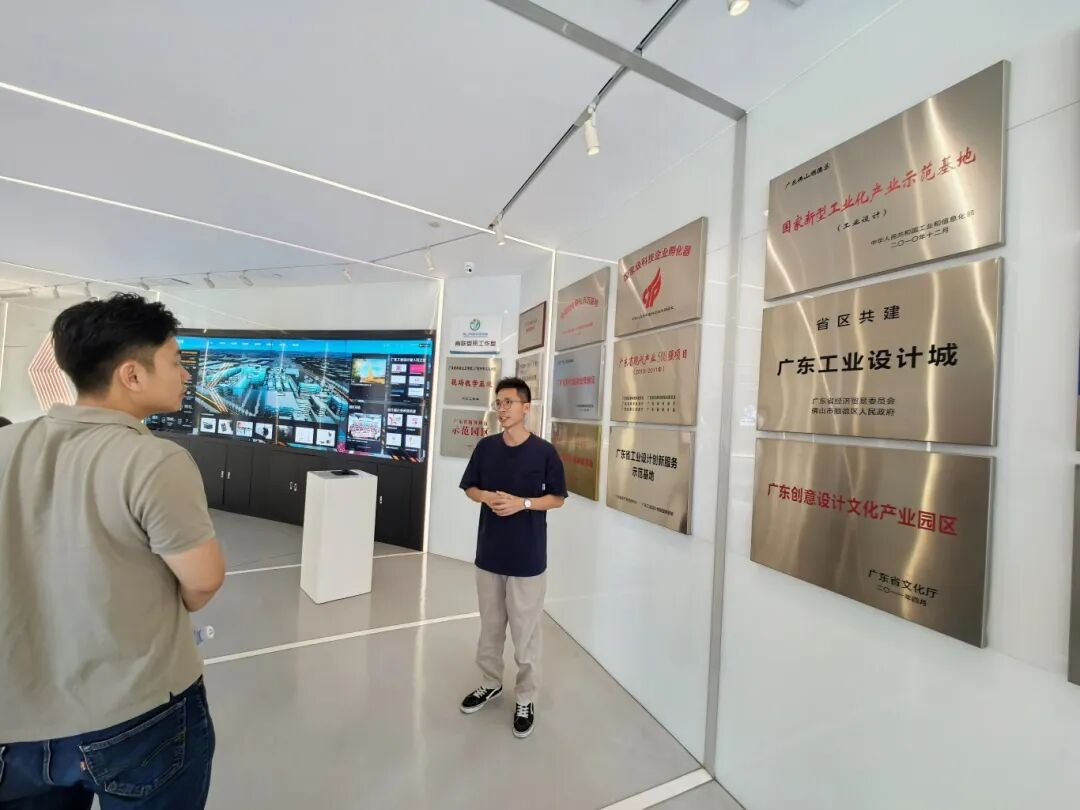 第二站是广东工业设计城。作为国家级工业设计示范基地,这里汇聚了 300 多家设计机构及配套企业、8000 多名设计师,是推动珠三角制造业转型升级的重要创新动力源。在工作人员引导下,同学们参观了多个设计工作室、创新实验室和产品展示中心,近距离观摩从概念设计到产品落地的完整创新流程。展区内,融合人工智能的智能家电、体现人文关怀的适老化家居用品、展现精湛工艺的高端装备以及彰显文化创意的特色产品等琳琅满目。与设计城企业代表和资深设计师卢传德的座谈中,同学们深入探讨了工业设计在提升产品附加值、优化用户体验和推动产业升级等方面的关键作用,对设计思维在商业实践中的应用价值有了更深刻的领悟。