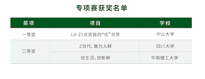 专项赛二等奖四川大学《Z世代,敢为人鲜》、华南理工大学《优生活,倍新鲜》项目演讲