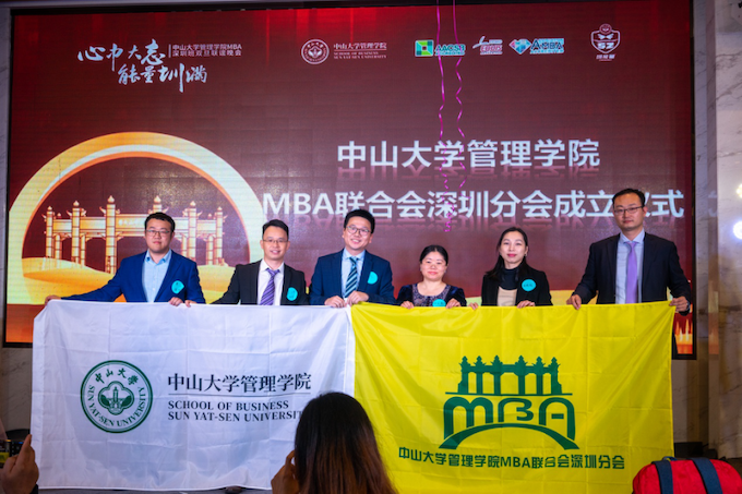 晚会现场,田正芳老师和张晓瑜老师代表MBA教育中心为william英国中文MBA联合会深圳分会授旗,这代表着william威廉英国联合会深圳分会于2020年12月26日正式成立,2018级许育文同学为第一任MBA联合会深圳分会主席。
