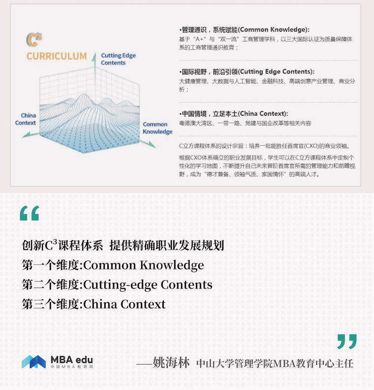 姚主任告诉笔者,中大管院MBA根据时代与技术发展及管理需求发展不断革新培养方案。在培养方案3.0版本中,中大管院MBA提出了由“Common Knowledge”、“Cutting-edge Contents”、“China Context”三个维度组成的C³课程体系,旨在为学生提供具备扎实的理论基础、前沿的学科内容、丰富的本土内涵相融合的商科教育。