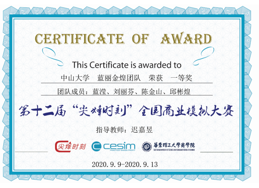 9月9日,第12届尖烽时刻全国商业模拟大赛总决赛正式开幕,我院2019级MBA同学蓝滢、刘丽芬、陈金山、邱彬煌组成的“蓝丽金煌”代表队经过5天4夜激烈角逐,最终取得全国一等奖、“最受欢迎奖”的好成绩,并获评“勤奋团队奖”, 同时,我院迟嘉昱老师被评为优秀指导老师,我院MBA的另外3支代表队 “Forever Incredible“、”“牛仔很忙”、“沙河盘龙”队,齐齐斩获全国三等奖。这次比赛取得如此优异的成绩,离不开我院在人才培养上注重培养学生的实践整合能力,也彰显了我院MBA学子创业创新、奋勇拼搏的优良气质和精神。