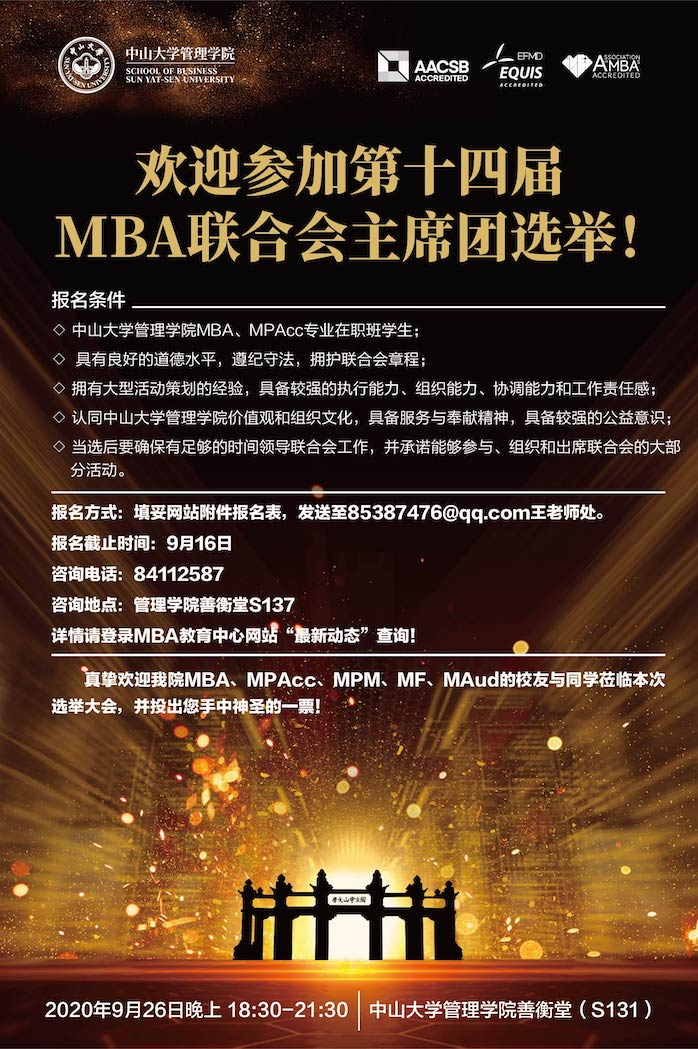 凡符合报名条件的MBA、MPAcc专业的在职班学生与全体校友均可报名参加本次联合会主席团选举。报名者请参见附件《第十四届MBA联合会选举方案》,填妥网站附件报名表,并于9月16日前发送至邮箱85387476@qq.com王老师处。如有疑问可联系王老师(电话84114115)咨询。