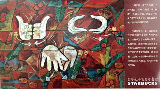 店长还向义工们赠送了明信片以作纪念。明信片由听障设计师设计,上面的三个手语分别代表了“平等”“融合”“勇敢”。