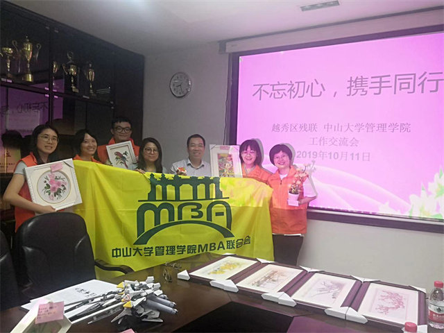 除了参观学习残健融合示范企业以外MBA联合会公益部与越秀区残疾人联合会共同进行了一场“不忘初心、携手同行”的主题座谈会,探讨如何通过双方的交流与合作,共同开展残疾人手工艺品义卖、工疗站参观等关爱残疾人的一系列特色活动。