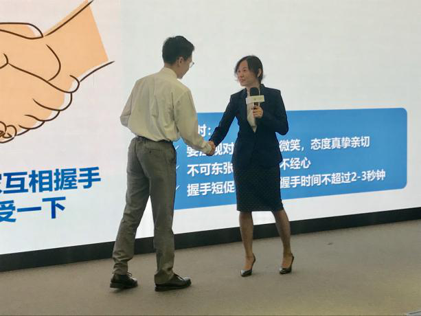 得体的礼仪习惯,有助于让商业伙伴认可自身的商业能力素质。课上,张岚老师邀请同学们上台参与礼仪场合的情景模拟,让同学们对初次会晤客户时如何交往寒暄,宴请客户时如何做到不失分寸地促成交易,有了深入的体验。此外,张岚老师通过自己面试他人的经历,向同学们强调仪容仪态的重要性。她还特别为女生讲解了正装的穿着规范,从配饰、裙装、条纹色彩搭配等细节分享了女士职场穿搭小技巧。