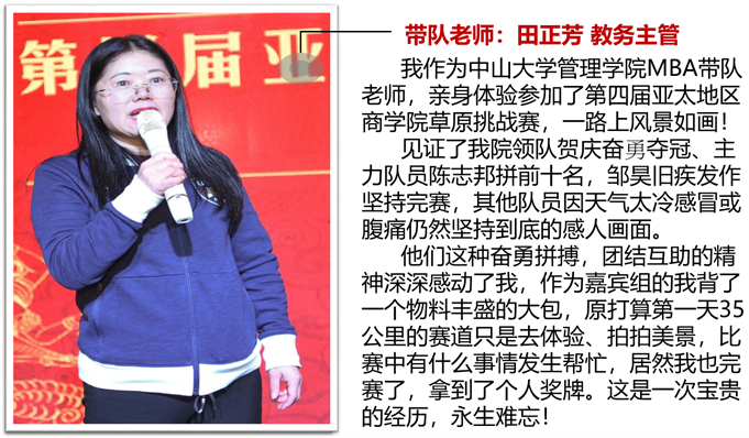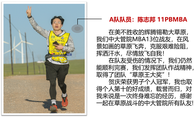7月5日-7日,第四届亚太地区商学院草原挑战赛(简称“草原王”在内蒙古辉腾锡勒大草原热烈举行,我院MBA教育中心田正芳老师带队,我院“中大飞龙”代表队共计13名队员奋勇出征,载誉而归,夺得赛事最高荣誉“草原王者奖”和团队第十名。领队贺庆荣获“男子组第一名”、队员陈志邦荣获“男子组第十名”。