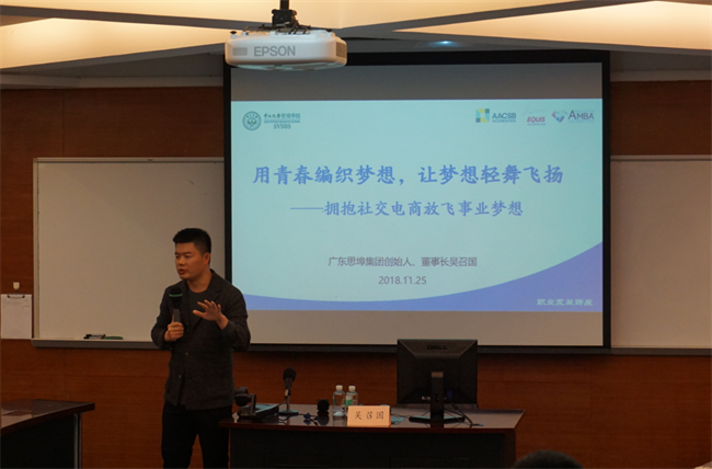 拥有丰富电商企业管理经验的吴召国先生,先从思埠集团如何从一个名不见经传的小企业,发展到如今闻名全国的微商领军企业为切入点,向同学们分享了思埠公司的成长经历。吴召国先生对思埠集团成长得与失的分享获得了在座同学一致认可与赞赏。