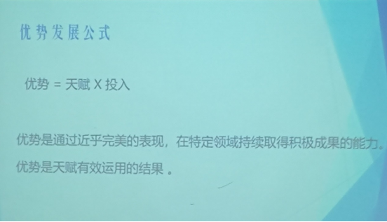 开场,蔡老师先提出两个问题,让同学思考什么是优势,为什么对优势有兴趣。随后,她通过与同学们的互动及对例子的解析,指出了不同才干的人以不同的方式,都可以达到相同的成就,从而推出结论:优势是天赋有效运用的结果。