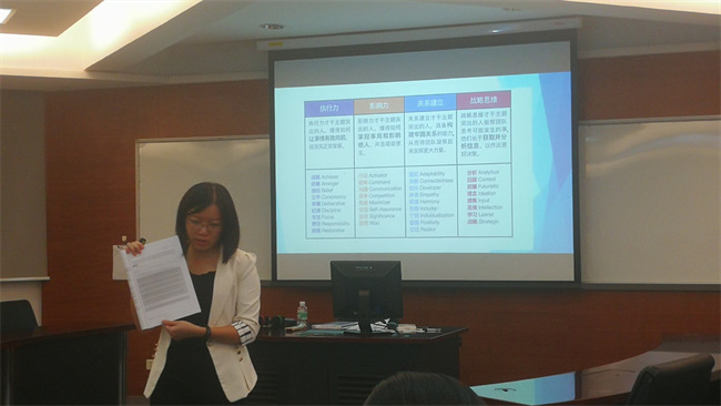 之后,老师介绍了发现优势的三种方法之一——盖洛普优势识别器的使用方法,先让同学们找出34个主题中最符合自己特征的五大主题,再与同桌进行两两介绍,最后结合同学们的报告做了详细的解读分析,让同学们能更深刻地认清自己的优势,便于思考在工作中如何扬长避短。