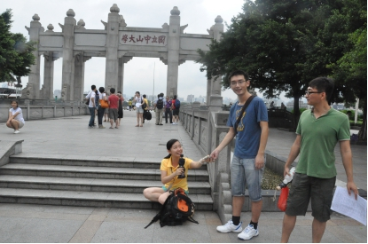 团队的核心是共同奉献,需要每一个队员为了共同的目标无私的付出,尽职尽责全力以赴地去保护自己的队友,依靠团队的力量,在相互信任的基础上达到成功。每当一个个任务完成后,我们都互相鼓励起来,“因为相信, 所以就什么也不怕了。” 第一个任务是到北门牌坊卖唱,请求路人施舍。首先我们用了美人计在牌坊附近选择了两个帅气的男生作为目标对象协助我们完成角色任务,附近围观的人也对我们的敬业精神表示赞叹。第一个项任务完成后大家笑声不断,跟刚来的时候大家因为天气的原因而抱怨连连的声音比起来,喜悦的笑声取代了抱怨。大家相互介绍认识,原来我们队里有做市场的、软件的、广告的、人力的,综合的,外贸的等等,在“天天向上”这个的大家庭里我们这个小队的成员来自各行各业,在拓展的未来的半天里,我们将面临很多的困难,要一起克服和超越自我、并肩做战、共同努力、完成使命。