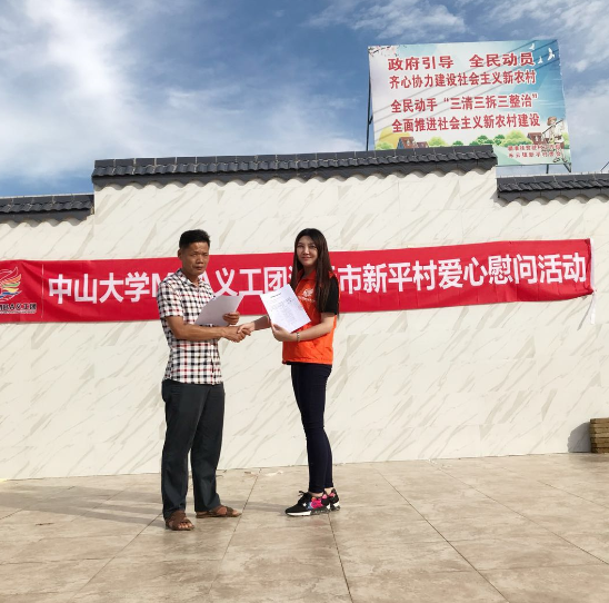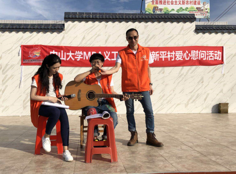 最后,在村文化广场进行了本次活动的捐赠交接仪式。义工团除了向村民和小朋友们赠送了风扇、椅子、洗衣粉、书籍、台灯等物资,同时向村委赠送了洗碗机和碗筷。新坪村村支书陈桂财与william英国中文MBA联合会主席李婵在村文化广场进行了捐赠品交接。随后,义工团的小伙伴17级同学罗俊杰、18级拟录取新生王艳为村民们弹奏了吉他,文化下乡,让村民们感受快乐与温暖。
