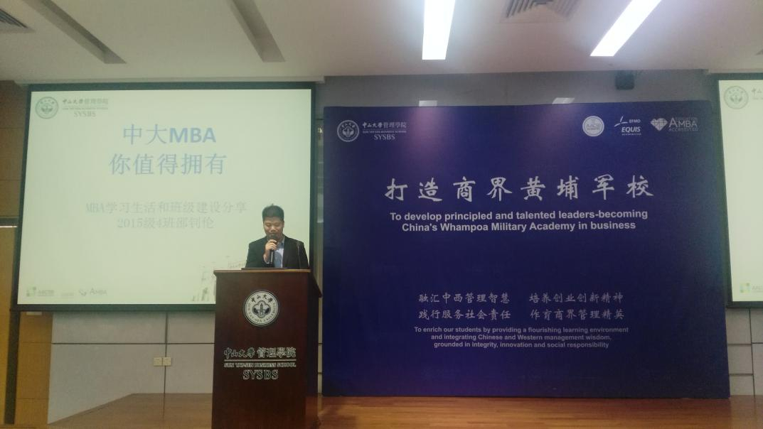 最后,在校学生2015级PTMBA4班邵钊伦同学对新生的到来表示欢迎,他结合自己在学院2年的成长历程,跟新生同学们分享了MBA学习生活和班级建设,提了关于班级建设建议及学习生活建设:确定好班委,各司其职,为同学办实事,多组织活动;好好学习,天天向上,多参加班级和学校活动,强化本专业,跨界学习,出去走走,看看外面的世界。