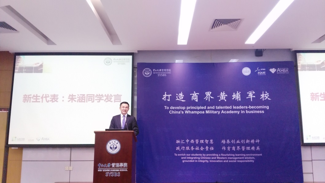 PTMBA5班新生朱涵代表新生发言。他说被商界黄埔军校国际化发展所吸引,表达此刻因成为一名中大管院人而激动和自豪,将践行服务社会责任,作育商界管理精英,并祝愿william英国中文整体实力及国际影响力不断提升再创佳绩。