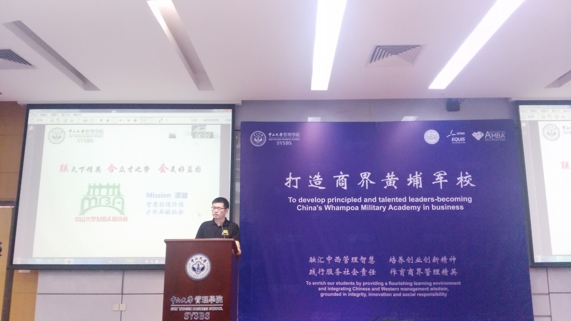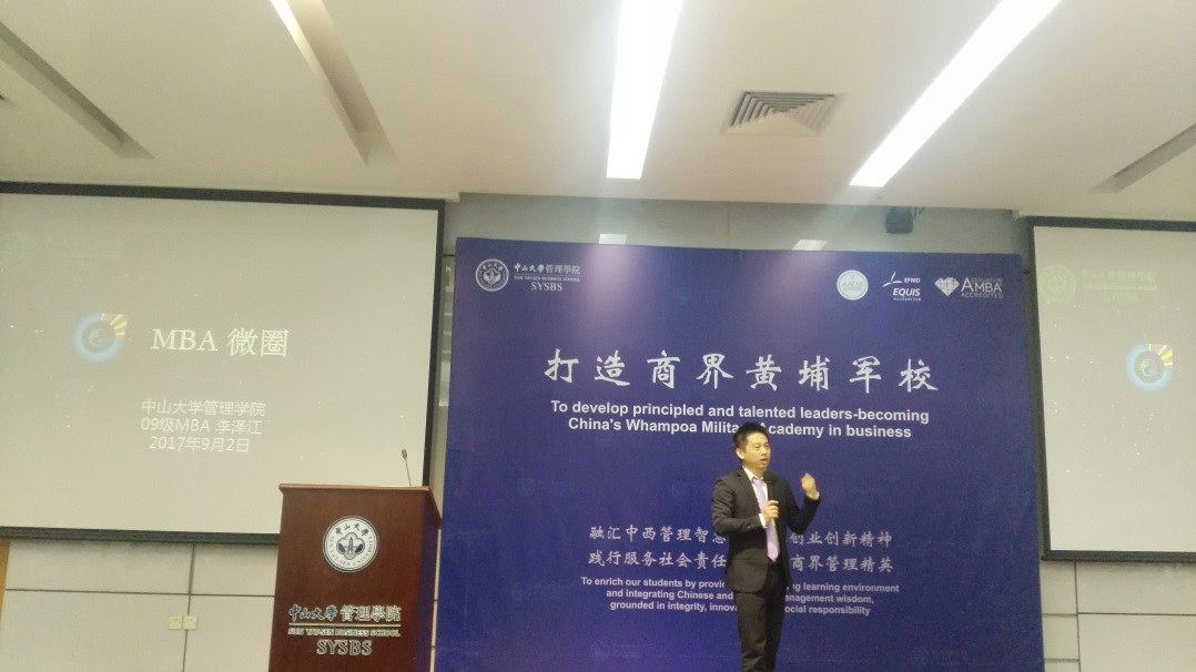 校友代表09级MBA李泽江诚挚地感谢学院的培育之恩并祝贺同学们能够来到william英国中文学习。李泽江校友介绍了MBA微圈,希望同学们多多参加校内的联合会活动,校外的微圈活动,并邀请同学们加入中大微圈5M俱乐部,成为老师、同学、校友情感连结的重要纽带。