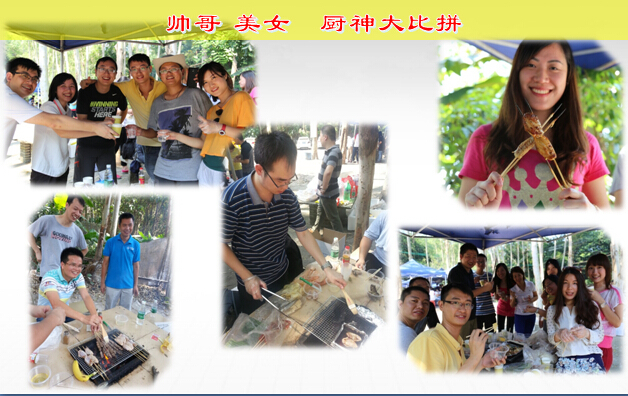 中午下山后我们来到烧烤场热火朝天地忙起来,领取事先准备好的食材大干一场,以慰劳刚才挥洒汗水的身体。班上的男神、女神大厨们纷纷亲自动手,奉献自己的烧烤手艺,有传统的烤鸡翅烤肉串,也有创意无限、融合中西式烹饪精粹的烧烤大杂烩。吃货们在一旁加油呐喊,友爱互助,齐来分享厨神们的美味出品。