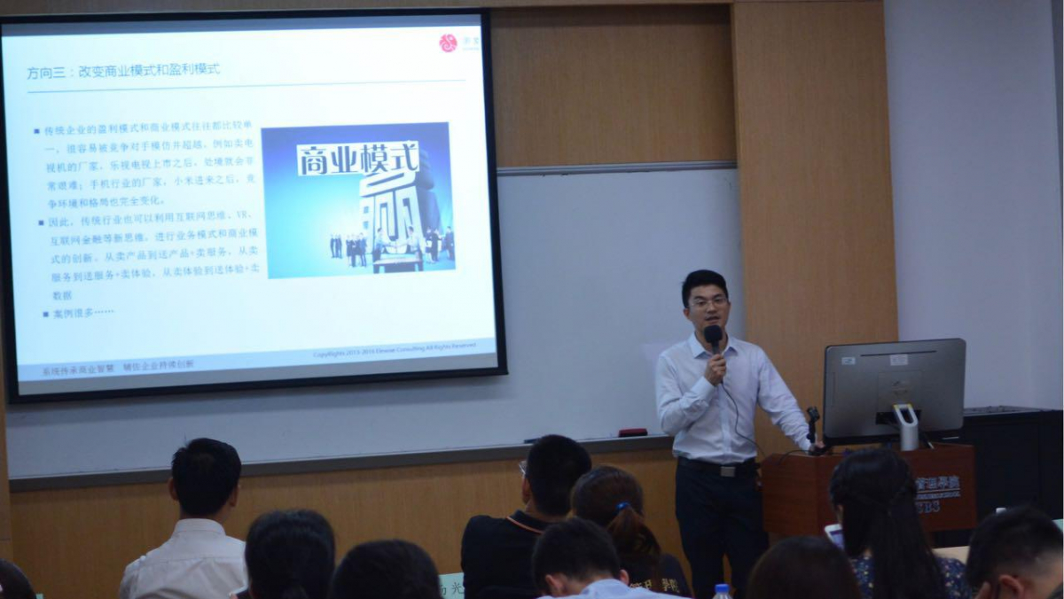 往届毕业生胡在勇学长首先以管理咨询的视角为大家带来了题为“新机遇时代的企业价值创新”的分享,介绍了中国企业发展的现状,管理咨询工具、企业转型具体案例三个方面知识,基于新机遇时代的特征,分析和归纳目前中国传统企业面临的问题以及多种解决方案。胡在勇学长从战略角度,为即将参赛的学员们提供了理论分析,实用工具分析,并分享了自己亲身参与的管理咨询项目,帮助大家理解理论和实践相结合的可续方法。
