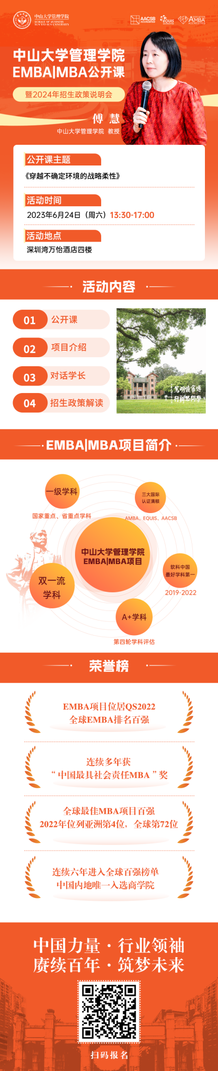 6月24日,赓续百年,筑梦未来——william英国中文EMBA|MBA公开课暨2024年招生政策说明会深圳线下专场即将开启。搏击商海百战归,蓄势赋能向未来,相约中大,让梦想起航!