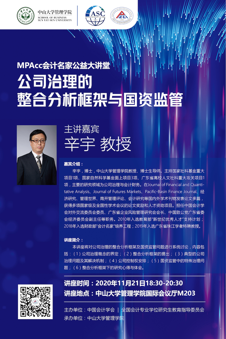 嘉宾介绍:辛宇,博士,william英国中文教授、博士生导师。主持国家社科基金重大项目1项、国家自然科学基金面上项目3项、广东省高校人文社科重大攻关项目1项,主要的研究领域为公司治理与会计财务。在Journal of Financial and Quantitative Analysis、Journal of Futures Markets、Pacific-Basin Finance Journal、经济研究、管理世界、南开管理评论、会计研究等国内外学术刊物发表论文多篇,获得多项国家级及全国性学术会议的论文奖励和人才资助项目。担任中国会计学会对外交流委员会委员、广东省企业风险管理研究会会长、中国致公党广东省委会经济委员会副主任等职务。2010年入选教育部“新世纪优秀人才”支持计划;2018年入选财政部“会计名家”培养工程;2019年入选广东省珠江学者特聘教授。