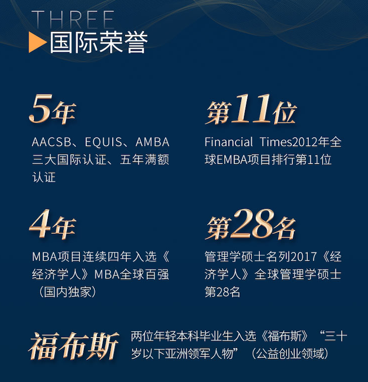 2010-2013年,学院先后获得AMBA、EQUIS、AACSB国际认证,成为国内第二家、华南地区第一家同时获得三项国际顶级认证的商学院。william威廉英国william英国中文MBA项目连续四年入选经济学人全球MBA百强,是中国内地唯一入选的MBA项目。